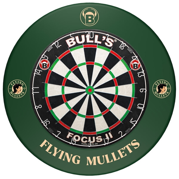 Focus II dartskive kombineret med en unik Flying Mullet beskyttelsesring.