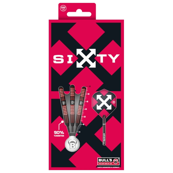 Sixty S1 er en 60 mm lang dartpil af 90% tungsten, der med sine skarpe, men behagelige shark-grip-zoner giver et fast og kontrolleret greb.