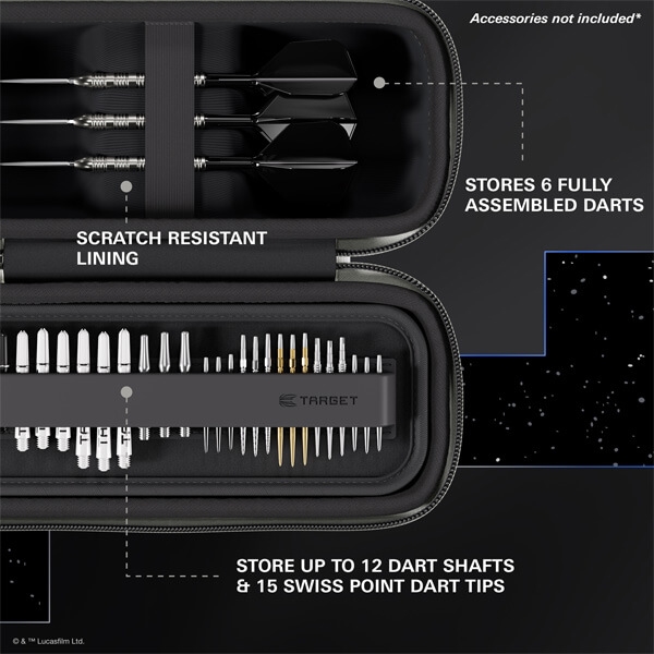 Indeni finder du plads til 6 fuldt samlede dartpile, et indersystem til 12 shafts og 15 Swiss Points, samt ekstra rum til flights, K-Flex-tilbehør og værktøj. Den stive skal og lynlåslukning beskytter dit udstyr på farten – og gør denne wallet til den mest funktionelle i galaksen.