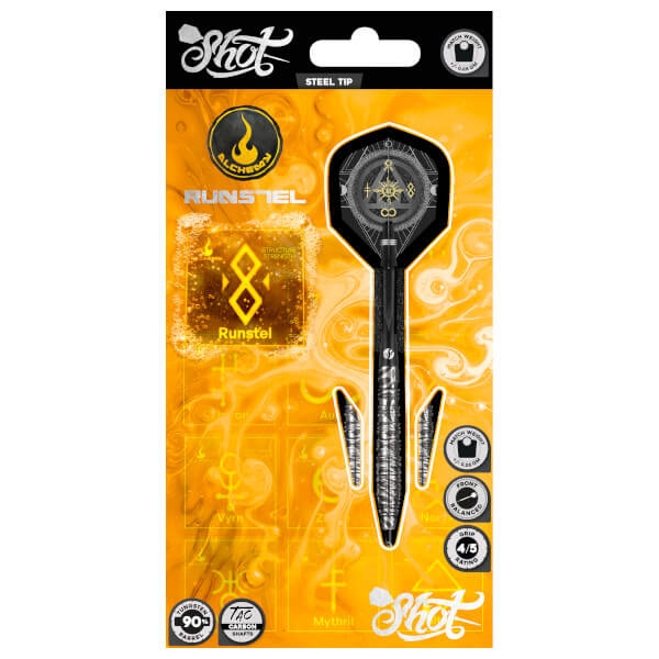 Alchemy Runstel 90% Steel Dart kombinerer holdbar tungsten-konstruktion med et gennemtænkt design, der giver stabil kontrol og præcise kast.