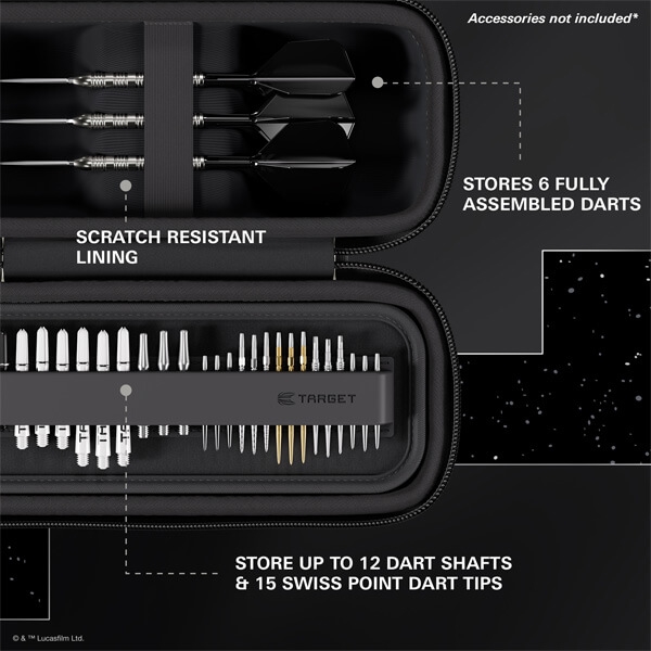 Med sin klassiske hvide rustning og markante sorte detaljer fanger walleten Stormtrooperens genkendelige udtryk og bringer Star Wars™-universet direkte til dartbanen. Indvendigt får du plads til 6 fuldt samlede dartpile, et traysystem til 12 shafts og 15 Swiss Point-spidser – den eneste dart-wallet i galaksen med dedikeret Swiss Point-opbevaring!