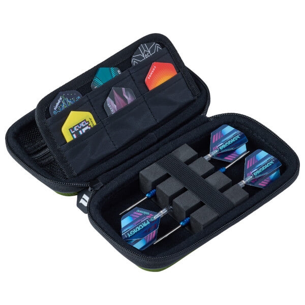 Den lille Vanguard-model rummer ét komplet sæt samlede dartpile, seks flightlommer, ni skaft-holdere og et praktisk lynlåsrum til ekstra tilbehør.