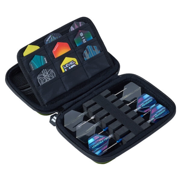 Etuiet har plads til to komplette sæt samlede dartpile, 9 flight-lommer, 18 skaft-holdere og et praktisk lynlåsrum til ekstra tilbehør.